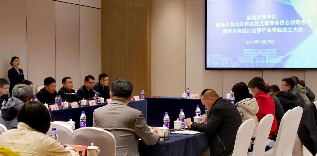12月22日下午,我校与宝鸡天台山风景名胜区管理委员会战略合作暨美术与设计创意产业学院成立大会在如意茵香茂御酒店举行。副校长冯飞龙出席大会并讲话。大会由美术与设计学院副院长马箖珺主持。