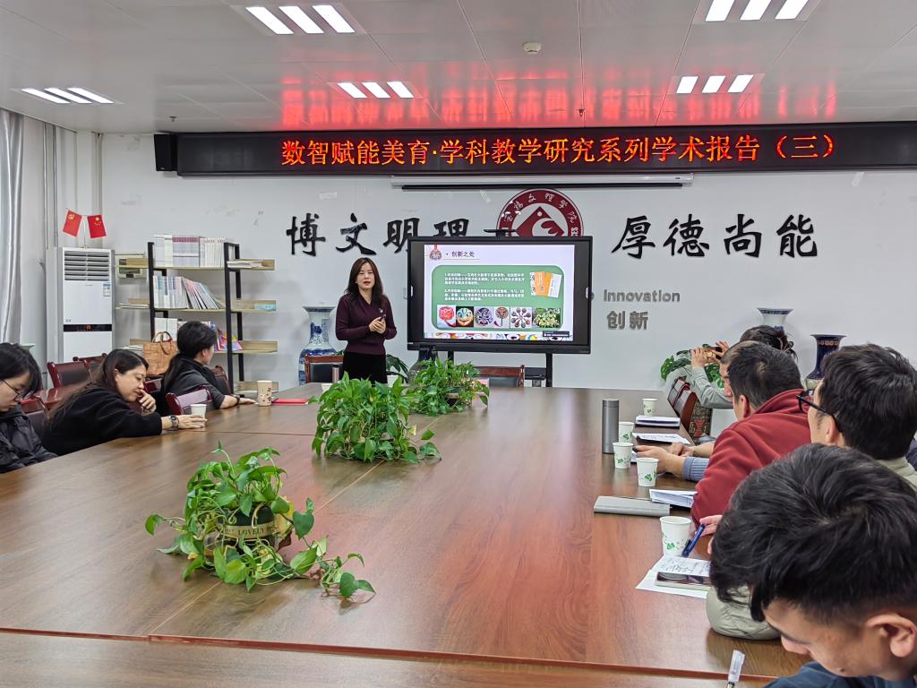 11月20日上午,宝鸡市陈仓区实验小学副校长袁亚妮,应邀在高新校区博文楼1301举行“数智赋能美育·学科教学研究”系列学术报告会(三)——《中小学美术特色课程开发的创新思路与案例解析》。本次报告会针对中小学美课程如何结合本地非物质文化资源开发情况进行了专项讲授。